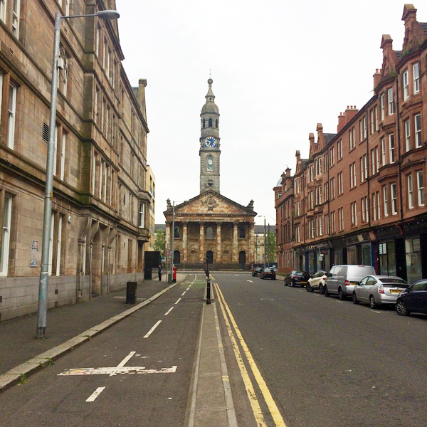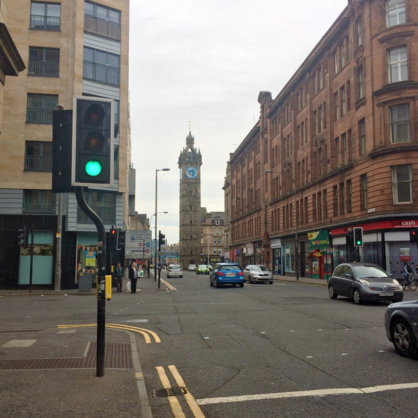 This was our first view of Glasgow Cross, the main intersection of the city. The clock tower is called Tolbooth Steeple and it’s all that remains of the original city center buildings.
